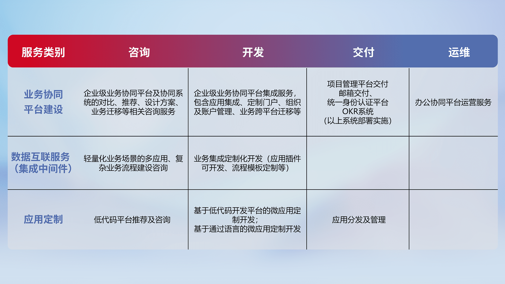 针对钉钉、、企微、、、、IDaas等平台级产品提供产品的规划、、、、方案、、、交付、、、定制化开发等服务,,,,实现如统一协同办公、、、智能客户服务、、、、混合会议管理、、智能数据查询、、、等业务场景,,,实现数字化转型。。