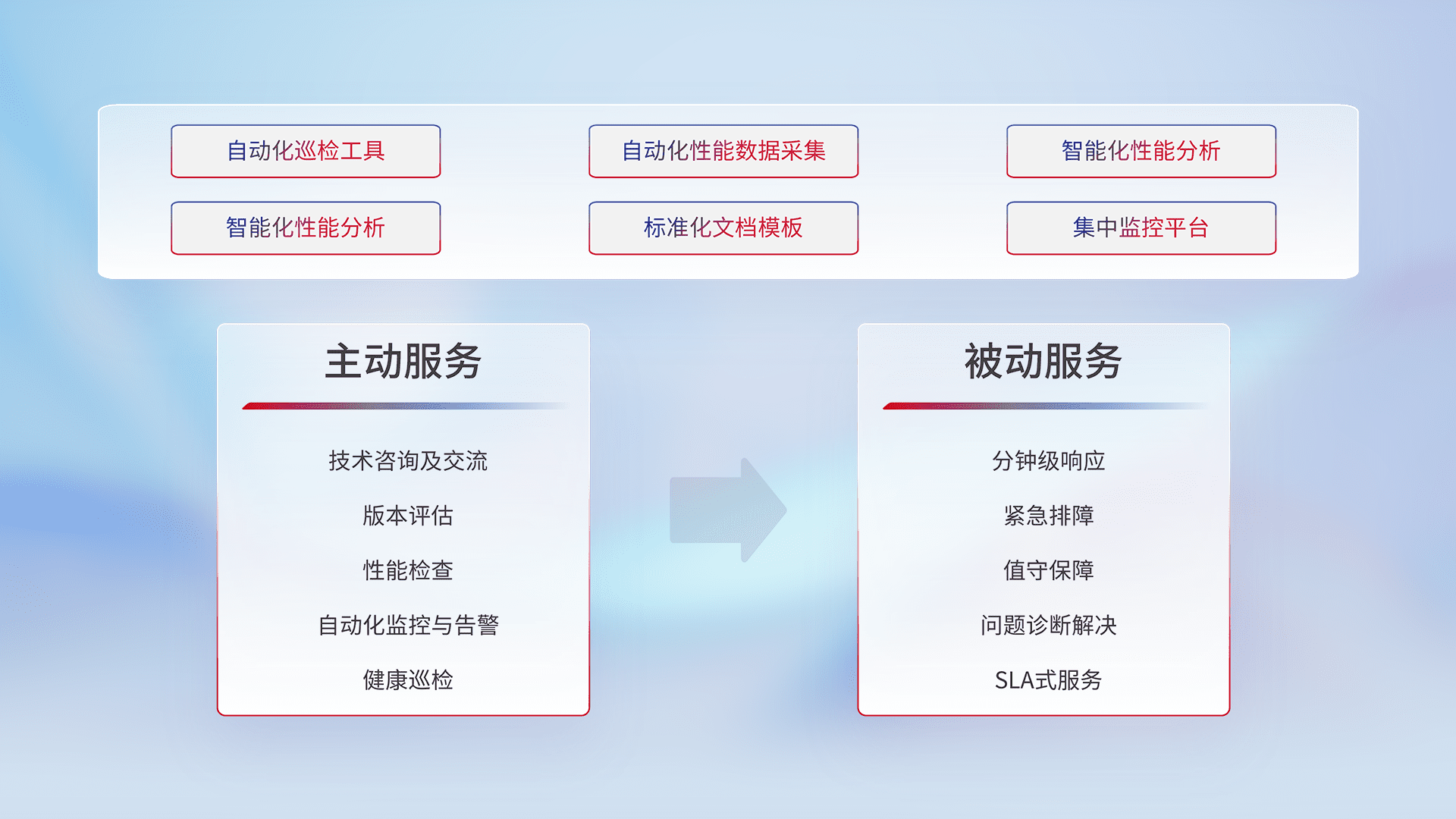 智能化工具和标准化文档,,,,保障服务质量,,提供主动服务(包含技术咨询、、、、版本评估、、、性能检查、、、自动化监控与告警、、、健康巡检)和被动服务包含(分钟级响应、、、紧急排障、、、值守保障、、问题诊断解决、、、、SLA服务)。。。。